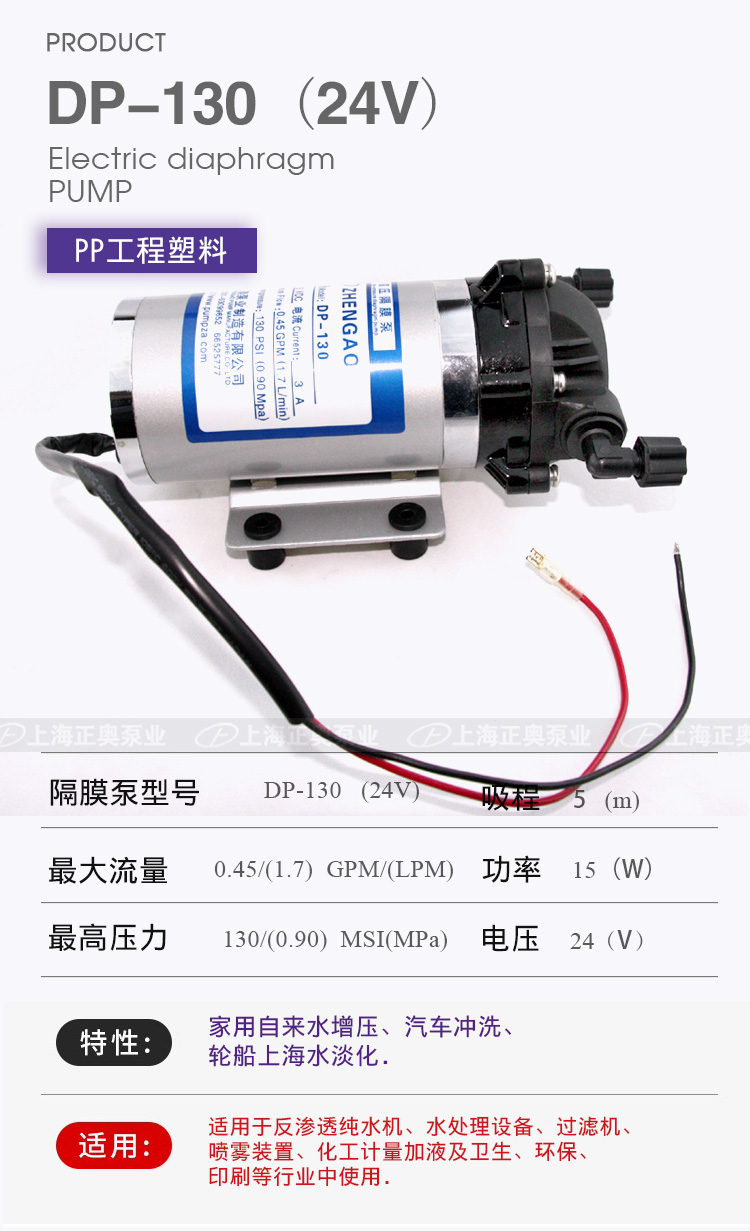 DP微型電動隔膜泵適用于家用自來水增壓、汽車沖洗、輪船上海水淡化,DP隔膜泵適用于反滲透純水機(jī)、水處理設(shè)備、過濾機(jī)、噴霧裝置、化工計量加液及衛(wèi)生、環(huán)保、印刷等行業(yè)中使用。