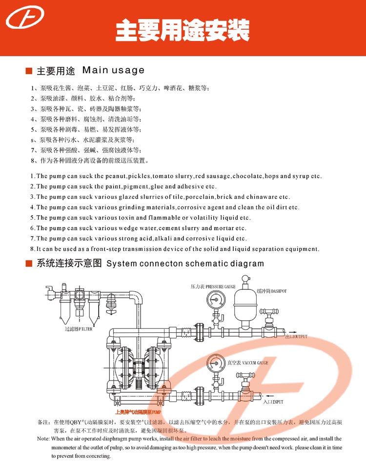 QBY型氣動(dòng)隔膜泵是一種采用壓縮空氣為動(dòng)力源,通過(guò)氣閥往復(fù)運(yùn)動(dòng)分配空氣,帶動(dòng)隔膜擠壓輸送介質(zhì)的容積式泵,該泵集雜質(zhì)泵、自吸泵、泥漿泵、屏蔽泵、潛水泵等輸送機(jī)械的優(yōu)點(diǎn)。該系列泵具有結(jié)構(gòu)美觀,良好的物理抗性,經(jīng)久耐用等特點(diǎn),對(duì)于各種腐蝕性液體、帶顆粒、高粘度、易揮發(fā)、易燃、易爆、劇毒的液體、陶瓷釉漿、果漿、膠水、油輪倉(cāng)底油回收、臨時(shí)倒罐等液體均能予以抽光吸盡,尤其可以解決葉片式泵的跑、冒、滴、漏及不允許空轉(zhuǎn)等問(wèn)題,該系列產(chǎn)品可利用普通干凈的工業(yè)氣或儀表氣,在0.1公斤的低壓下啟動(dòng),在正常輸送狀況下節(jié)約用氣量30%以上,具有良好的市場(chǎng)前景。