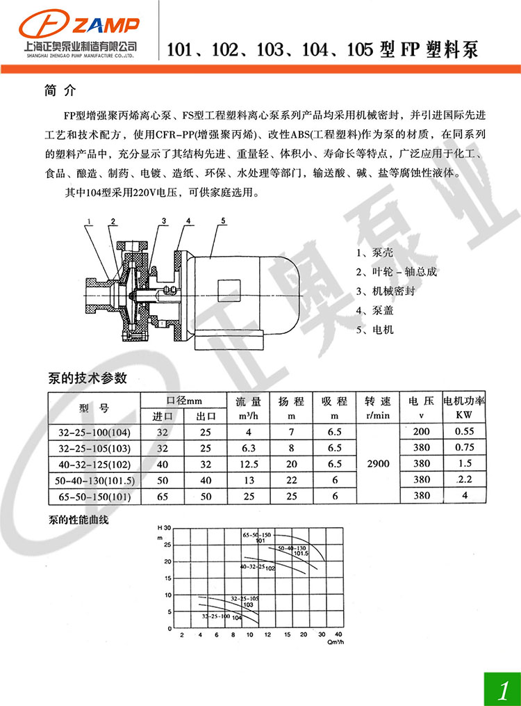 正奧公司生產(chǎn)的101型、102型、103型、104型、105型泵系單吸直聯(lián)式塑料離心泵是一種小型塑料泵,產(chǎn)品結(jié)構(gòu)較、體積小、重量輕、耗電省、耐酸堿、密封好、維修方便。FS型工程塑料離心泵系列產(chǎn)品均采用機(jī)械密封全使用改性ABS(工程塑料)作為泵的材質(zhì),在同系列的塑料泵產(chǎn)品中,充分顯示了其結(jié)構(gòu)、重量輕、體積小、壽命長(zhǎng)等特點(diǎn),廣泛應(yīng)用于化工,食品、制藥、電鍍、造紙、環(huán)保、水處理等部門(mén),輸送酸、堿、鹽等腐蝕性液體。其中104型采用220V電壓,可供家庭選用。