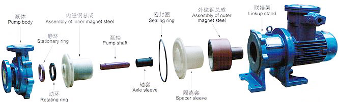 驅(qū)動裝置采用主動磁鐵聯(lián)軸器直接裝在電機(jī)軸上,泵室完全封閉,通過磁力偶合間接驅(qū)動泵軸上帶磁鐵的葉輪旋轉(zhuǎn)結(jié)構(gòu)緊湊。
