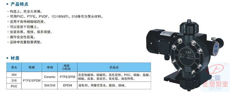 2. 可用PVC、PTFE、PVDF、1Cr18Ni9Ti、316等作為泵頭材料。