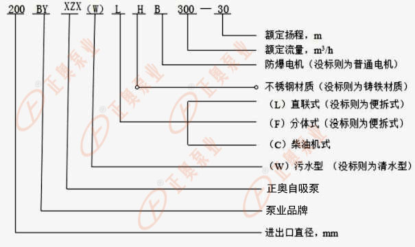 200-泵吸入口徑(mm) ZAZSW-正奧牌強(qiáng)自吸排污泵 (沒標(biāo)W則為清水型)L-直連式、F-分體式、C-柴油機(jī)式(沒標(biāo)則為便拆式)H-不銹鋼材質(zhì)(沒標(biāo)則為鑄鐵材質(zhì))B-防爆電機(jī)(沒標(biāo)則為普通電機(jī))300-額定流量(m3/h)30-額定揚(yáng)程(m)