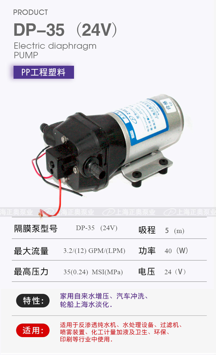 DP微型電動(dòng)隔膜泵適用于家用自來水增壓、汽車沖洗、輪船上海水淡化,DP隔膜泵適用于反滲透純水機(jī)、水處理設(shè)備、過濾機(jī)、噴霧裝置、化工計(jì)量加液及衛(wèi)生、環(huán)保、印刷等行業(yè)中使用。