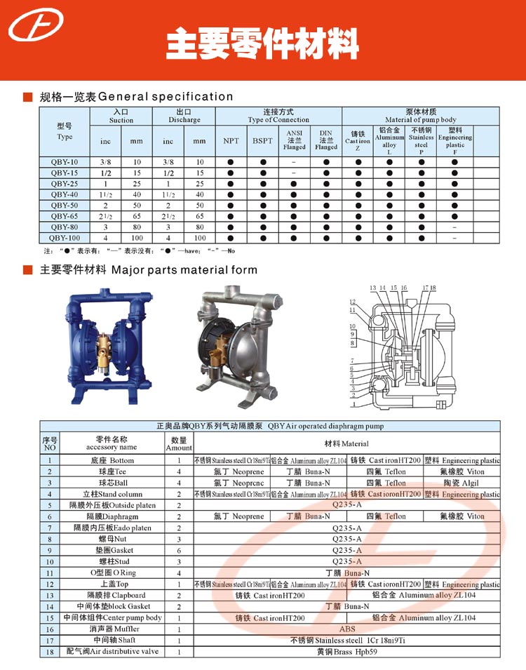 正奧公司目前已形成系列化生產(chǎn),共有八種規(guī)格直徑:φ10mm(3/8')、φ15mm(1/2')、φ25mm(1')、φ40mm(11/2')、φ50mm(2')、φ65mm(21/2')、φ80mm(3')、φ100mm(4')。五種材質(zhì):鋁合金、鑄鐵、不銹鋼、工程塑料、襯里(襯膠隔膜泵,襯氟隔膜泵)。隔膜泵根據(jù)不同液體介質(zhì)分別采用丁晴橡膠、氯丁橡膠、氟橡膠、聚四氟乙烯隔膜。以滿足不同用戶的需要。