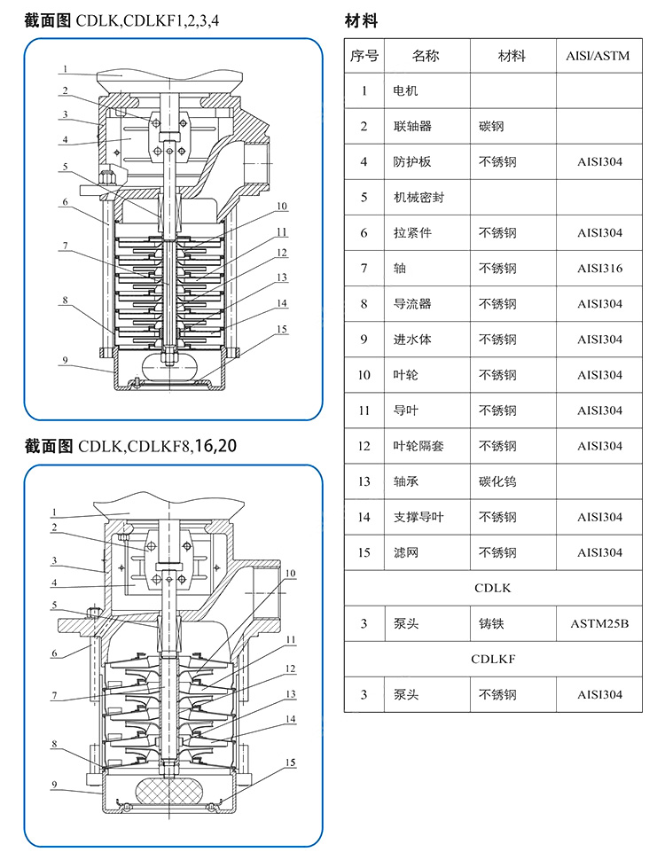 CDLK/CDLKF為安裝標(biāo)準(zhǔn)電機(jī)的自吸立式多級(jí)離心液下泵,電機(jī)軸通過泵頭用聯(lián)軸器直接與泵軸聯(lián)接,泵可根據(jù)需要配置智能保護(hù)器,對(duì)泵干轉(zhuǎn)、缺相、過載等進(jìn)行有效保護(hù)。為滿足水槽或容器的安裝深度,可安裝空腔體來改變泵本身的長度,不同的級(jí)數(shù)長度見尺寸和重量表和可供產(chǎn)品范圍表。